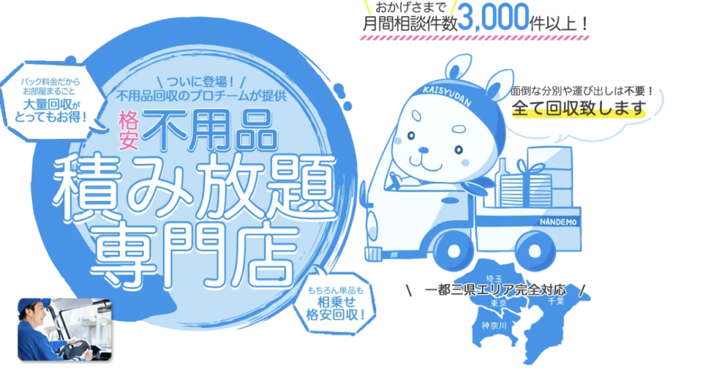 不用品なんでも回収団は、関東一円をカバーする片付け支援サービスです。回収対象は不用品にとどまらず、ゴミ屋敷清掃や遺品整理まで幅広く対応しています。少量の処分から大規模な撤去まで、さまざまなケースに柔軟に対応しており、スピード感と丁寧さを兼ね備えた対応力が特長です。自治体で断られた物品も相談可能で、悪天候時でも状況に応じて対応してくれる信頼あるサービスです。